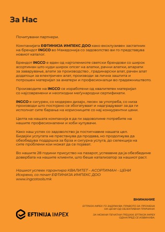 %u0417%u0430 %u041d%u0430%u0441%u041f%u043e%u0447%u0438%u0442%u0443%u0432%u0430%u043d%u0438 %u043f%u0430%u0440%u0442%u043d%u0435%u0440%u0438.%u041a%u043e%u043c%u043f%u0430%u043d%u0438%u0458%u0430%u0442%u0430 %u0415%u0424%u0422%u0418%u041d%u0418%u0408%u0410 %u0418%u041c%u041f%u0415%u041a%u0421 %u0414%u041e%u041e %u043a%u0430%u043a%u043e %u0435%u043a%u0441%u043a%u043b%u0443%u0437%u0438%u0432%u0435%u043d %u0437%u0430%u0441%u0442%u0430%u043f%u043d%u0438%u043a%u043d%u0430 %u0431%u0440%u0435%u043d%u0434%u043e%u0442 INGCO %u0432%u043e %u041c%u0430%u043a%u0435%u0434%u043e%u043d%u0438%u0458%u0430 %u0441%u043e %u0437%u0430%u0434%u043e%u0432%u043e%u043b%u0441%u0442%u0432%u043e %u0432%u0438 %u0433%u043e %u043f%u0440%u0435%u0434%u0441%u0442%u0430%u0432%u0443%u0432%u0430%u043d%u043e%u0432%u0438%u043e%u0442 %u043a%u0430%u0442%u0430%u043b%u043e%u0433.%u0411%u0440%u0435%u043d%u0434%u043e%u0442 INGCO %u0435 %u0435%u0434%u0435%u043d %u043e%u0434 %u043d%u0430%u0458%u0433%u043e%u043b%u0435%u043c%u0438%u043e%u0442e %u0441%u0432%u0435%u0442%u0441%u043a%u0438 %u0431%u0440%u0435%u043d%u0434%u043e%u0432%u0438 %u0441%u043e %u0448%u0438%u0440%u043e%u043a%u0430%u0441%u043e%u0440%u0442%u0438%u043c%u0430%u043d %u0448%u0442%u043e %u043d%u0443%u0434%u0438 %u0448%u0438%u0440%u043e%u043a %u043e%u043f%u0441%u0435%u0433 %u043d%u0430 %u0430%u043b%u0430%u0442%u043a%u0438, %u0440%u0430%u0447%u043d%u0438 %u0430%u043b%u0430%u0442%u043a%u0438, %u0430%u043f%u0430%u0440%u0430%u0442%u0438%u0437%u0430 %u0437%u0430%u0432%u0430%u0440%u0443%u0432%u0430%u045a%u0435, %u0430%u043b%u0430%u0442%u0438 %u0437%u0430 %u043f%u0440%u043e%u0438%u0437%u0432%u043e%u0434%u0441%u0442%u0432%u043e , %u0433%u0440%u0430%u0434%u0438%u043d%u0430%u0440%u0441%u043a%u0438 %u0430%u043b%u0430%u0442, %u0440%u0430%u0447%u0435%u043d %u0430%u043b%u0430%u0442%u0434%u043e%u0434%u0430%u0442%u043e%u0446%u0438 %u0437%u0430 %u0435%u043b%u0435%u043a%u0442%u0440%u0438%u0447%u0435%u043d %u0430%u043b%u0430%u0442, %u043f%u0440%u043e%u0438%u0437%u0432%u043e%u0434%u0438 %u0437%u0430 %u043b%u0438%u0447%u043d%u0430 %u0437%u0430%u0448%u0442%u0438%u0442%u0430 %u0438%u043f%u043e%u0442%u0440%u043e%u0448%u0435%u043d %u043c%u0430%u0442%u0435%u0440%u0438%u0458%u0430%u043b %u0437%u0430 %u0430%u043c%u0430%u0442%u0435%u0440%u0438 %u0438 %u043f%u0440%u043e%u0444%u0435%u0441%u0438%u043e%u043d%u0430%u043b%u0446%u0438 %u0432%u043e %u0433%u0440%u0430%u0434%u0435%u0436%u043d%u0438%u0448%u0442%u0432%u043e%u0442%u043e.%u041f%u0440%u043e%u0438%u0437%u0432%u043e%u0434%u0438%u0442%u0435 %u043d%u0430 INGCO %u0441%u0435 %u0438%u0437%u0440%u0430%u0431%u043e%u0442%u0435%u043d%u0438 %u043e%u0434 %u043a%u0432%u0430%u043b%u0438%u0442%u0435%u0442e%u043d %u043c%u0430%u0442%u0435%u0440%u0438%u0458%u0430%u043b%u0441%u043e %u043d%u0430%u0458%u0441%u043e%u0432%u0440%u0435%u043c%u0435%u043d%u0438 %u0438 %u043d%u0435%u043e%u043f%u0445%u043e%u0434%u043d%u0438 %u043c%u0435%u0453%u0443%u043d%u0430%u0440%u043e%u0434%u043d%u0438 %u0441%u0435%u0440%u0442%u0438%u0444%u0438%u043a%u0430%u0442%u0438.INGCO %u0435 %u0441%u0438%u0433%u0443%u0440%u0435%u043d, %u0441%u043e %u043c%u043e%u0434%u0435%u0440%u0435%u043d %u0434%u0438%u0437%u0430%u0458%u043d, %u043b%u0435%u0441%u0435%u043d %u0437%u0430 %u0443%u043f%u043e%u0442%u0440%u0435%u0431%u0430, %u0441%u043e %u043d%u0438%u0437%u0430%u043f%u0440%u043e%u0438%u0437%u0432%u043e%u0434%u0438 %u0448%u0442%u043e %u043f%u043e%u0441%u0442%u043e%u0458%u0430%u043d%u043e %u0441%u0435 %u0437%u0431%u043e%u0433%u0430%u0442%u0443%u0432%u0430%u0430%u0442 %u0438 %u043d%u0430%u0434%u0433%u0440%u0430%u0434%u0443%u0432%u0430%u0430%u0442 %u0437%u0430 %u0434%u0430 %u0433%u0438%u0438%u0441%u043f%u043e%u043b%u043d%u0430%u0442 %u0441%u0438%u0442%u0435 %u0431%u0430%u0440%u0430%u045a%u0430 %u043d%u0430 %u043a%u043e%u0440%u0438%u0441%u043d%u0438%u0446%u0438%u0442%u0435 %u0441%u043e %u043d%u0430%u0458 %u043a%u043e%u043d%u043a%u0443%u0440%u0435%u043d%u0442%u043d%u0438 %u0446%u0435%u043d%u0438.%u0426%u0435%u043b%u0442%u0430 %u043d%u0430 %u043d%u0430%u0448%u0430%u0442%u0430 %u043a%u043e%u043c%u043f%u0430%u043d%u0438%u0458%u0430 %u0435 %u0434%u0430 %u0433%u0438 %u0437%u0430%u0434%u043e%u0432%u043e%u043b%u0438%u043c%u0435 %u043f%u043e%u0442%u0440%u0435%u0431%u0438%u0442%u0435 %u043d%u0430%u043d%u0430%u0448%u0438%u0442%u0435 %u043f%u0440%u043e%u0444%u0435%u0441%u0438%u043e%u043d%u0430%u043b%u0435%u043d%u0438 %u0438 %u0445%u043e%u0431%u0438 %u043a%u0443%u043f%u0443%u0432%u0430%u0447%u0438.%u041a%u0430%u043a%u043e %u043d%u0430%u0448 %u0443%u0441%u043f%u0435%u0445 %u0441%u043e %u0437%u0430%u0434%u043e%u0432%u043e%u043b%u0441%u0442%u0432%u043e %u0458%u0430 %u043f%u043e%u0441%u0442%u0438%u0433%u043d%u0430%u0432%u043c%u0435 %u043d%u0430%u0448%u0430%u0442%u0430 %u0446%u0435%u043b.%u0411%u0438%u0434%u0435%u0458%u045c%u0438 %u0443%u0441%u043b%u0443%u0433%u0430%u0442%u0430 %u043d%u0435 %u043f%u0440%u0435%u0441%u0442%u0430%u043d%u0443%u0432%u0430 %u0434%u0430 %u043f%u0440%u043e%u0434%u0430%u0432%u0430, %u043d%u043e %u043f%u0440%u043e%u0434%u043e%u043b%u0436%u0443%u0432%u0430 %u0434%u0430%u043e%u0431%u0435%u0437%u0431%u0435%u0434%u0443%u0432%u0430 %u043f%u043e%u0434%u0434%u0440%u0448%u043a%u0430 %u0437%u0430 %u0431%u0440%u0437%u0430 %u0438 %u0441%u0438%u0433%u0443%u0440%u043d%u0430 %u0443%u0441%u043b%u0443%u0433%u0430, %u0434%u043e %u0441%u0435%u043b%u0435%u043a%u0446%u0438%u0458%u0430 %u043d%u0430%u0441%u0438%u0442%u0435 %u043f%u0440%u043e%u0431%u043b%u0435%u043c%u0438 %u043a%u043e%u0438 %u043c%u043e%u0436%u0430%u0442 %u0434%u0430 %u0441%u0435 %u043f%u043e%u0458%u0430%u0432%u0430%u0442.%u0412%u043e %u043d%u0430%u0448%u0438%u0442%u0435 28 %u0433%u043e%u0434%u0438%u043d%u0438 %u043f%u0440%u0438%u0441%u0443%u0441%u0442%u0432%u043e %u043d%u0430 %u043f%u0430%u0437%u0430%u0440%u043e%u0442, %u0443%u0441%u043f%u0435%u0430%u0432%u043c%u0435 %u0434%u0430 %u0458%u0430 %u043e%u0431%u0435%u0437%u0431%u0435%u0434%u0438%u043c%u0435%u0434%u043e%u0432%u0435%u0440%u0431%u0430%u0442%u0430 %u043d%u0430 %u043d%u0430%u0448%u0438%u0442%u0435 %u043a%u04