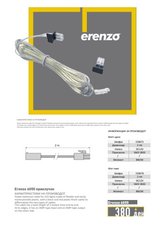 Power extension cable for LED lights made of flexible and easily maneuverable plas%ufffdc, with a black and red plas%ufffdc finish useful to differen%ufffdate the two types of cables. This cable has a total length of 2 meters from end to end. At its edges, it has an AMP-type input and an AMP-type output on the other side.%u041a%u0410%u0420%u0410%u041a%u0422%u0415%u0420%u0418%u0421%u0422%u0418%u041a%u0418 %u041d%u0410 %u041f%u0420%u041e%u0418%u0417%u0412%u041e%u0414%u041e%u0422Erenzo 6055 %u043f%u0440%u0438%u043a%u043b%u0443%u0447%u043e%u043a380 %u0434%u0435%u043dErenzo 6055%u0418%u041d%u0424%u041e%u0420%u041c%u0410%u0426%u0418%u0418 %u0417%u0410 %u041f%u0420%u041e%u0418%u0417%u0412%u041e%u0414%u041e%u0422%u041c%u0430%u0442%u0442 %u0446%u0440%u043d%u043e%u041c%u0430%u0442 %u0441%u0438%u0432%u043e%u0428%u0438%u0444%u0440%u0430 233671%u0414%u0438%u043c%u0435%u043d%u0437%u0438%u0458%u0430 2 mt%u041d%u0430%u043f%u043e%u043d DC12V%u041f%u0440%u0438%u043a%u043b%u0443%u0447%u043e%u043a SMD 2835/ /%u041c%u043e%u045c%u043d%u043e%u0441%u0442 8W/M%u0428%u0438%u0444%u0440%u0430 233670%u0414%u0438%u043c%u0435%u043d%u0437%u0438%u0458%u0430 2 mt%u041d%u0430%u043f%u043e%u043d DC12V%u041f%u0440%u0438%u043a%u043b%u0443%u0447%u043e%u043a SMD 2835/ /%u041c%u043e%u045c%u043d%u043e%u0441%u0442 8W/M%u041a%u0410%u0420%u0410%u041a%u0422%u0415%u0420%u0418%u0421%u0422%u0418%u041a%u0418 %u041d%u0410 %u041f%u0420%u041e%u0418%u0417%u0412%u041e%u0414%u041e%u0422Power extension cable for LED lights made of flexible and easily maneuverable plas%ufffdc, with a black and red plas%ufffdc finish useful to differen%ufffdate the two types of cables. This cable has a total length of 2 meters from end to end. At its edges, it has an AMP-type input and an AMP-type output on the other side. Each box contains 25 units of extension cord, brand new, ready to use.
