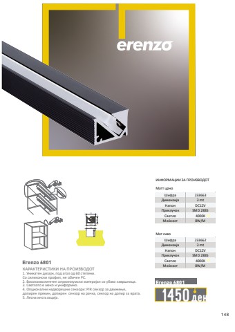 1. %u0423%u043d%u0438%u043a%u0430%u0442%u0435%u043d %u0434%u0438%u0437%u0430%u0458%u043d, %u043f%u043e%u0434 %u0430%u0433%u043e%u043b %u043e%u0434 60 %u0441%u0442%u0435%u043f%u0435%u043d%u0438. %u0421%u043e %u0441%u0438%u043b%u0438%u043a%u043e%u043d%u0441%u043a%u0438 %u043f%u0440%u043e%u0444%u0438%u043b, %u043d%u0435 %u043e%u0431%u0438%u0447%u0435%u043d %u0420%u0421.2. %u0412%u0438%u0441%u043e%u043a%u043e%u043a%u0432%u0430%u043b%u0438%u0442%u0435%u0442%u0435%u043d %u0430%u043b%u0443%u043c%u0438%u043d%u0438%u0443%u043c%u0441%u043a%u0438 %u043c%u0430%u0442%u0435%u0440%u0438%u0458%u0430%u043b %u0441%u043e %u0443%u0431%u0430%u0432%u0430 %u0437%u0430%u0432%u0440%u0448%u043d%u0438%u0446%u0430.3. %u0421%u0432%u0435%u0442%u043b%u043e%u0442%u043e %u0435 %u043c%u0435%u043a%u043e %u0438 %u0443%u043d%u0438%u0444%u043e%u0440%u043c%u043d%u043e.4. %u041e%u043f%u0446%u0438%u043e%u043d%u0430%u043b%u043d%u0438 %u043d%u0430%u0434%u0432%u043e%u0440%u0435%u0448%u043d%u0438 %u0441%u0435%u043d%u0437%u043e%u0440%u0438: PIR %u0441%u0435%u043d%u0437%u043e%u0440 %u0437%u0430 %u0434%u0432%u0438%u0436%u0435%u045a%u0435, %u0434%u043e%u043f%u0438%u0440%u0435%u043d %u043f%u0440%u0435%u043a%u0438%u043d, %u0434%u043e%u043f%u0438%u0440%u0435%u043d %u0441%u0435%u043d%u0437%u043e%u0440 %u043d%u0430 %u0440%u0430%u0447%u043a%u0430, %u0441%u0435%u043d%u0437%u043e%u0440 %u043d%u0430 %u0434%u043e%u043f%u0438%u0440 %u0437%u0430 %u0432%u0440%u0430%u0442%u0430.5. %u041b%u0435%u0441%u043d%u0430 %u0438%u043d%u0441%u0442%u0430%u043b%u0430%u0446%u0438%u0458%u0430.%u041a%u0410%u0420%u0410%u041a%u0422%u0415%u0420%u0418%u0421%u0422%u0418%u041a%u0418 %u041d%u0410 %u041f%u0420%u041e%u0418%u0417%u0412%u041e%u0414%u041e%u0422Erenzo 68011450%u0434%u0435%u043dErenzo 6801%u0418%u041d%u0424%u041e%u0420%u041c%u0410%u0426%u0418%u0418 %u0417%u0410 %u041f%u0420%u041e%u0418%u0417%u0412%u041e%u0414%u041e%u0422%u041c%u0430%u0442%u0442 %u0446%u0440%u043d%u043e%u041c%u0430%u0442 %u0441%u0438%u0432%u043e%u0428%u0438%u0444%u0440%u0430 233663%u0414%u0438%u043c%u0435%u043d%u0437%u0438%u0458%u0430 3 mt%u041d%u0430%u043f%u043e%u043d DC12V%u041f%u0440%u0438%u043a%u043b%u0443%u0447%u043e%u043a SMD 2835%u0421%u0432%u0435%u0442%u043b%u043e 4000K%u041c%u043e%u045c%u043d%u043e%u0441%u0442 8W/M%u0428%u0438%u0444%u0440%u0430 233662%u0414%u0438%u043c%u0435%u043d%u0437%u0438%u0458%u0430 3 mt%u041d%u0430%u043f%u043e%u043d DC12V%u041f%u0440%u0438%u043a%u043b%u0443%u0447%u043e%u043a SMD 2835%u0421%u0432%u0435%u0442%u043b%u043e 4000K%u041c%u043e%u045c%u043d%u043e%u0441%u0442 8W/M